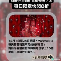 著名芬蘭設計品牌Marimekko 的罌粟花圖案家品及包袋一向都很受歡迎,而日本Marimekko 更經常推出當地限定配色及套裝,送禮自用都夠特別🛍️適逢聖誕季,日本Marimekko 官網不但推出3重優惠,更有不少冬日配色的限定日本限定系列!✨ —————— 目錄 💖官網限量贈品 >>> 圖4 💖秋冬商品Pre-sale7折 >>> 圖5-9 💖每日限定快閃8折 >>> 圖10-13 💖官網節日限定套裝 >>> 圖14-16 💖日本限定冬日餐具 >>> 圖17 —————— 🎁秋冬商品 Pre-sale 7 折 (30% off): 服飾、袋、配飾等部分秋冬商品,現在已經進入 Pre-sale 階段,全面享受 7 折優惠! 🎁滿額限量贈品: 只要買滿 ¥27,500 日圓,就送特別版 Tumma 印花 Tote Bag,還會收到聖誕特別版包裝! 🎁每日限定快閃 8 折: 從 12 月 日 日至 24 日期間,Marimekko 每天都會精選不同的商品提供 8 折優惠! 商品內容會在日本時間每日早上 10 時更新(星期六日除外)! —————— 🛍️ 7 折必買推介 1. Mini Manual Unikko 縮骨遮 (Product ID: 24667) ☂️ 配色: 紅色 × 紫丁香色 / 米白 × 藍色。 價格: 原價 ¥12,100 JPY,7 折價 ¥8,470 JPY,約港幣 $425。 2. Neat Crossbody Unikko S 斜揹袋 (Product ID: 24717) 🎨 特色: 可容納 iPad Mini。 配色: 深藍 × 藍色 / 淺黃 × 米色。 價格: 原價 ¥15,400 JPY,7 折價 ¥10,780 JPY,約港幣 $537。 3. Vankka Logo Placement Tote (Product ID: 24915/24916) 💻 特色: 可容納 13 吋電腦。 配色: 黑色 × 米白 / 紅色 × 藍色。 價格: 原價 ¥13,200 JPY,7 折價 ¥9,240 JPY,約港幣 $464。 4. Vankka Unikko Placement Tote (Product ID: 25241/25242) 🌸 特色: 可容納 13 吋 iPad。 配色: 紫羅蘭 × 米白 / 灰色 × 米白。 價格: 原價 ¥13,200 JPY,7 折價 ¥9,240 JPY,約港幣 $464。 —————— 📅 每日快閃 8 折!Advert Calendar活動教學 想知道怎麼搶到每日 8 折的限定好物嗎?操作超簡單! 前往活動頁面: 在日本官網找到紅色字樣的「アドベントカレンダー」,點下後再按 Holiday advent calendar 前往活動頁面! 揭開獎勵: 進入頁面後,選擇今日的日期 (例如圖中所示的 12 月 8 日)! 確認折扣: 🎁 以撰文當日 (12 月 8 日) 為例,當天的特價商品就是抱枕套,8 折後價錢約落在 $327 至 $574。要登入後才可以看見折扣價! —————— 🎁 日本線上限定 Unikko 禮物組合 🌟🥂 Unikko 托特包 & Juhla Unikko 馬克杯套裝 (Product ID: 25729/25730: ¥16,500 JPY,約港幣 $828。 🍷 Mug Set (共通): 包含 2 個 Juhla Unikko 馬克杯,採用華麗的金屬金色與勃艮第紅色設計。 👜 Tote Bag (可選): 套裝附有限定純棉 Unikko Tote,可選擇酒紅或海軍藍配色。尺寸為高 43cm / 寬 43 cm / 底寬 1cm / 提把高 22cm。 附贈 Unikko 賀卡 1 張、Unikko 貼紙 1 張,以及 1 塊圖案隨機的裁切布料。 —————— ☕ 居家儀式感必備:日本限定 Pikkuinen Unikko 冬日餐具 🍵🎀 ✨ 【日本限定】Pikkuinen Unikko 馬克杯 250ml & 碟子 13.5cm (Product ID: 25700/25701) 這組餐具採用了粉紅 × 酒紅配色,充滿冬日溫馨感! 可用於微波爐、焗爐、洗碗機及冰格。 單個價格為 ¥4,180 JPY,約港幣 $209。 快啲去 Marimekko 日本官網度望吓,千祈唔好錯過任何一個優惠驚喜!🏃♀️💨 **價格以2025年12月8日,根據資料以5.02算日元匯率計算總價 **價錢只供參考! 一切以商戶為準 #Marimekko #日本限定 #聖誕節 #聖誕禮物 #AdvertCalendar #秋冬折扣 #節日限定 #家品