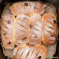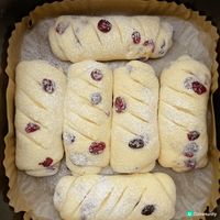 氣炸鍋紅莓麵包卷 麵包鬆軟香甜,酸酸甜甜 做法簡單,新手都可以做! 食材: 150g純牛奶、18g玉米油、1顆雞蛋、3g酵母、35g 白砂糖、250g高筋麵粉、40g紅莓乾,刮刀翻拌至無乾粉狀態。 做法: 1、150g純牛奶、18g玉米油、1顆雞蛋、3g酵母、 35g白砂糖、攪拌均勻,250g高筋麵粉,40g蔓越莓乾,刮刀翻拌至無乾粉狀態。 2.保鮮膜覆蓋靜置30分鐘,揭開保鮮膜,手上沾水, 將麵團拉伸向中間折疊幾次。蓋上保鮮膜發酵至原麵團 2倍大。 3、面板撒一些乾麵粉,麵團輕輕按壓平整,分成6 份,團成圓球,蓋保鮮膜鬆弛20分鐘,擀成牛舌狀, 兩邊往中間對折,再擀一下,從上往下捲起來,捏緊收口。 4.放進氣炸鍋,不開火二次醒發20分鐘,醒發好後篩入一些麵粉再割口,氣炸鍋155度20分鐘,翻面再烤10分鐘。 #我想試下整甜品