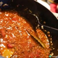2. 燒熱鍋下橄欖油,炒香洋蔥及蒜蓉,再加入免治豬肉兜炒至半熟。放甘筍、百里香、罐頭蕃茄、及雞湯。落適量糖、鹽和黑胡椒調味,蓋蓋子小火煮約30分鐘至收水。