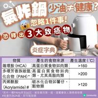 成日聽人講氣炸鍋「#低油健康」,係唔係真係咁美好🤔 實情係:雖然用油量減少咗,但高溫烹調一樣會產生致癌物!用錯溫度仲分分鐘炸出一級致癌物😨 #氣炸鍋 原理係點🔍 🔍 用熱空氣對流加熱食物,蒸發表面水分 🔍 產生梅納反應,製造金黃香脆口感(同油炸效果相似) #高溫煮食 釋出3大有害物⚠️ 1️⃣ 糖化終產物 (AGEs):超過130°C產生,加速身體氧化、老化,形成皺紋、暗瘡。 2️⃣ 丙烯酰胺:超過120°C產生,2A級可能致癌物。測試:氣炸薯條含量最多相差68倍,部分超歐盟標準! 3️⃣ 苯並[a]芘:超過200°C產生,一級致癌物!食物中脂肪分解釋出。 Andy San 安全使用4式💡 ✅ 控制溫度:盡量用150°C以下,避免超過200°C ✅ 縮短時間:時間越長,致癌物越多 ✅ 多用水煮蒸:日常煮食以70-100°C低溫為主 ✅ 偶爾食用:氣炸食物唔好當家常便飯 =============== 想得到第一手「#發炎」及「#消炎」資訊, 加入 炎症研究學會 🔥 資訊谷,一齊擊退炎症!! 📌 https://bit.ly/2TZWCL4 =============== 查詢更多👇🏻炎症研究學會👇🏻官方頻道 💕官方FB:@炎症研究學會 🔗https://www.facebook.com/inflammation.secrets 💕官方IG:@Andy San 營養教主 🔗https://www.instagram.com/andysan_iii/ 💕官方YT:@營養教主Andy Sanさん 🔗https://www.youtube.com/@andysan_iii 💕官方小紅書:@營養教主AndySan 🔗https://www.xiaohongshu.com/user/profile/63bbbf920000000027029535 =============== #炎症字典 #氣炸鍋 #致癌物 #丙烯酰胺 #苯並芘 #梅納反應 #測試 #健康烹調 #低溫煮食 #蒸煮最健康 #空氣炸鍋陷阱 #營養教主AndySan #測試 #氣炸鍋 #丙烯酰胺 #高溫煮食 #炎症字典 #發炎」及「 #消炎」資訊, #致癌物 #營養教主AndySan #低油健康」,係唔係真係咁美好🤔 #苯並芘 #梅納反應 #健康烹調 #低溫煮食 #蒸煮最健康 #空氣炸鍋陷阱 (此文章由U Blog 同步發佈至社群)