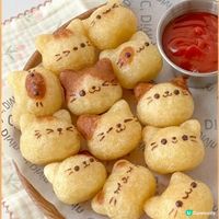 3. 最後擠上朱古力(或蠔油)畫成炸蝦尾的眼及嘴,以及擠上茄汁扮成手捧的愛心即成。(*可用蠔油或紫菜條取替朱古力唷~)