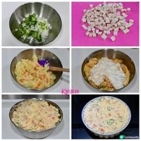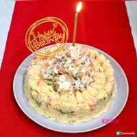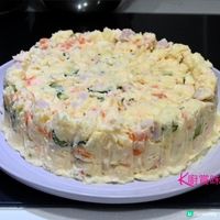 [脆炸蝦球日式薯仔沙律(生日蛋糕)]✨花點心思給不愛甜食的另一半 沙律也能變成創意的生日蛋糕🎂🎂✨ 沙律經常是我宴客的菜式,只要花點心思去裝飾,餐前小食也可變身成生日蛋糕。 這次仿日式薯仔沙律,香滑的薯蓉軟綿綿,薯蓉仍帶有粒狀口感,加入清爽青瓜,鹹香火腿,味道上更豐富。 為甚麼說仿日式? 因為沒有用日式沙律醬,用了酸忌廉(sour cream)、奇妙醬來調味,還有去掉辛辣味的洋蔥,及擁有天然甜味的甘筍,沙律也能變成創意「沙律生日蛋糕🎂🎂」,簡單就是美味。 食譜分享🙏🙏 材料: 薯仔 6個 1853g 虎蝦 12隻 407g 洋蔥 半個 143g 甘筍 半條 312g 青瓜 1條172g 雞蛋 8隻 火腿扒 1塊200g 鮮蕃茜 20g 酸忌廉香蔥醬 1盒 220g 奇妙醬 200g 鹽 2g 做法: 1️⃣雞蛋烚熟,剝殼,切粒。 2️⃣青瓜切薄片,加入半茶匙鹽拌勻,醃10分鐘,用飲用水冲洗,榨乾水,備用。 3️⃣洋蔥切幼條,再切碎,放入飲用水內浸1-2分鐘,榨乾水,備用。 4️⃣火腿扒切粒。 5️⃣鮮蕃茜切碎。 6️⃣薯仔、甘筍去皮,切粒,烚15分鐘,盛起。趁熱,輕輕壓成蓉(仍保持粒狀)。加入切粒雞蛋、青瓜片、洋蔥條、火腿粒、鮮番茜碎、奇妙醬和酸忌廉香蔥醬一起拌勻,放入雪櫃冷藏,薯仔沙律完成。 7️⃣急凍虎蝦解凍後,用廚紙徹底抹乾水,用刀在蝦背上𠝹開,再用手取一小撮鹽、少許胡椒粉調味,再沾上薄薄低筋麵粉。 8️⃣燒熱適量油,放下剛沾上低筋麵粉虎蝦炸熟,再拌入適量奇妙醬和鮮蕃茜碎。 9️⃣薯仔沙律放入器皿內,倒扣在碟上,再放上做法8️⃣沙律蝦球,脆炸蝦球薯仔沙律(生日蛋糕🎂)即成。 烹調心得: 洋蔥切條後,用飲用水浸1-2分鐘,便可以去掉洋蔥辛辣味。 #脆炸蝦球日式薯仔沙律 #脆炸蝦球日式薯仔沙律生日蛋糕 #炸蝦球 #沙律蝦球 #日式薯仔沙律 #生日蛋糕 #K廚賞味 #KamieKKitchen #K廚煮食日常 #Kamie日常煮意 #KamieKamCooking #cookingwithKamie #速煮系列 #廚娘系列 #西式食譜 #生日蛋糕 #ucreator #打卡美食 #相機食先 #COOKwithUCreator