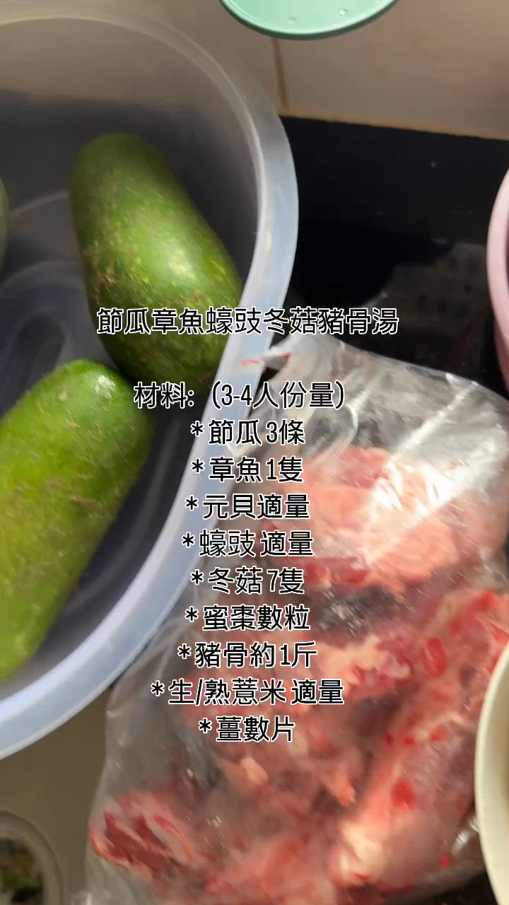節瓜章魚蠔豉冬菇豬骨湯 具有有益氣養血,健脾利尿、清熱解暑等功效 材料:(3-4人份量) * 節瓜 3條 * 章魚 1隻 * 元貝適量 * 蠔豉 適量 * 冬菇 7隻 * 蜜棗數粒 * 豬骨約 1斤 * 生/熟薏米 適量 * 薑數片 步驟︰ 1. 將節瓜去皮切塊,洗淨備用 2.乾章魚需要浸泡軟化 3.乾冬菇先洗淨再浸泡後去蒂,增加湯的香氣和味道。 4.豬骨洗淨汆水再備用 5.蜜棗、元貝、蠔豉、生/熟薏米可依個人喜好添加,洗淨備用 6.將所有材料放入壓力煲,加入足夠清水,大火煮滾後轉小火約半小時。 * 溫馨提示: * 泡發冬菇既水可以留反,用來煲湯,可以增加湯風味 #yingying煲湯系列 如果你中意我個短片,記得like & follow💕 #吃貨#香港#家常便飯#煲湯#foodie#食盡香港#美食家#美食地圖#美食分享#吃吃吃#吃喝玩樂#美食#美食日記#美食推薦#美食摄影#享受生活
