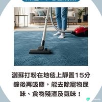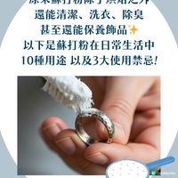 蘇打粉(又稱小蘇打) 這個看似平凡的白色粉末,其實是居家生活的「魔法師」!除了烘焙之外,它不僅能清潔、洗衣、除臭,甚至還能保養飾品✨以下是蘇打粉在日常生活中不可思議的10種用途: 1/ 廚房去除油污 混合蘇打粉與水成糊狀,輕鬆去除爐台油垢、微波爐污漬,連難洗的咖啡杯茶漬都能KO! 2/ 去除水垢 蘇打粉能夠去除掉不太嚴重的水垢,若不銹鋼杯裡如果有無法用清潔劑刷掉的水痕,可以使用蘇打粉加溫水浸泡,便能有效去除 3/ 天然除臭劑 冰箱若出現異味,放一小碗蘇打粉,能夠有效的去除掉空氣中的異味。也可撒在鞋櫃、垃圾桶底部,中和難聞氣味 4/ 除衣物髒污 衣服上如果有泛黃的汗漬或是頑固髒污,可在洗衣時加入半杯蘇打粉,增強去污力,讓白色衣物更亮白,能夠增強去污效果 5/ 衣櫃吸濕 蘇打粉有吸附濕氣的功能,將蘇打粉分裝在小罐子,然後包上一層透氣網布,靜置在衣櫃或是需要除濕的櫥櫃,能夠達到去除濕氣效果 6/ 銀飾保養 銀飾戴久了容易氧化發黑,而蘇打粉有去氧化效果,用牙刷沾蘇打粉輕刷,再使用布沾濕輕輕擦拭,就能恢復光澤 7/ 疏通排水管 當水管堵塞時,可將蘇打粉灑在排水口附近,再沖入熱水,泡沫反應可分解輕微阻塞,等待一小時後再打開水龍頭使用,就能疏通水管! 8/ 地毯清潔 灑蘇打粉在地毯上靜置15分鐘後再吸塵,能去除寵物尿味、食物殘渣及氣味! 9/ 清洗蔬果 清洗蔬果時在水盤中加一匙蘇打粉,能夠幫助去除農藥殘留,緊記之後仍要用清水沖洗蔬果! 10/ 窗軌隙縫清潔 窗軌隙縫的死角位總是很難清潔!其實只要撒少許蘇打粉,之後用舊牙刷深入清潔,便能帶走陳年灰塵! #家居 #攻略 #家居清潔 #除臭 #蘇打粉 #小蘇打 #生活好物 #生活冷知識