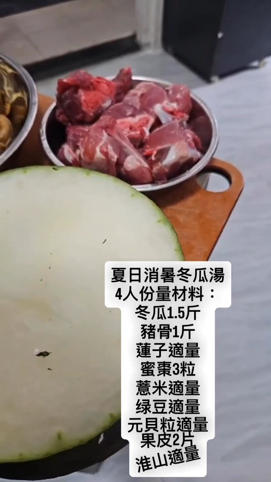 夏日消暑冬瓜湯 而家夏天熱辣辣,最適合煲D清熱解暑靚湯🥰 冬瓜湯係夏天有消暑解渴、利尿消腫、清熱解毒的功效❤️ 4人份量材料: 冬瓜1.5斤 豬骨1斤 蓮子適量 蜜棗3粒 薏米適量 绿豆適量 元貝粒適量 果皮2片 淮山適量 如果你中意我個短片,記得like & follow💕 #yingying煲湯系列 步驟: 1.豬骨先出水(將豬骨放入凍水煲至起泡,直至見到污糟物為止) 2.將污糟物拎出,然後將水倒去 3. 將冬瓜切塊,洗淨備用 4.將豬骨再跟材料清洗清洗後放入煲中 5.用壓力煲煲滾後,明火1小時30分後即可 #吃貨#香港#家常便飯#煲湯#foodie#食盡香港#美食家#美食地圖#美食分享#吃吃吃#吃喝玩樂#美食#美食日記#美食推薦#美食摄影#享受生活