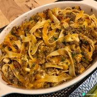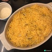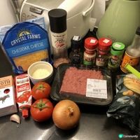 《放工快煮系列》 **雙重芝士焗肉醬意粉 材料 (2人份): 意粉 140g 免治牛肉 300g 洋蔥 半個 切小粒 蒜頭 1瓣 切片 紅酒/雞湯/牛湯 100ml 蕃茄 2-3個 切粒 或 罐頭蕃茄碎 250g 茄膏 1湯匙 喼汁 1茶匙 月桂葉 2塊 乾百里香 1/2茶匙 蒜粉 1/2茶匙 鹽、黑胡椒 隨意 芝士碎 (我用咗車打+巴馬臣芝士) 隨意 做法: 1. 下油熱鑊,中火爆香洋蔥、蒜頭後移到一旁,下免治肉弄散,煎至兩面轉色。 2. 下紅酒/高湯,煮滾後下蕃茄、茄膏、喼汁、月桂葉、百里香、蒜粉拌勻,再煮滾後轉小火煮15-20分鐘, 間中攪拌。同一時間,煲滾一煲水,下一茶匙鹽,按包裝指示減1-2分鐘煮熟意粉,保留部分意粉水。 3. 意粉加進醬汁內拌勻,按需要下適量意粉水調整醬汁濃稠度。放入焗盤內,鋪上芝士碎,入已預熱200度焗爐焗2-3分鐘至芝士金黃,即成。