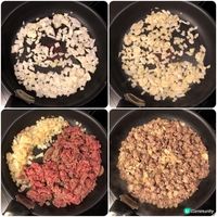2. 燒熱鍋下橄欖油,炒香洋蔥及蒜蓉,再加入免治豬肉兜炒至半熟。放甘筍、百里香、罐頭蕃茄、及雞湯。落適量糖、鹽和黑胡椒調味,蓋蓋子小火煮約30分鐘至收水。