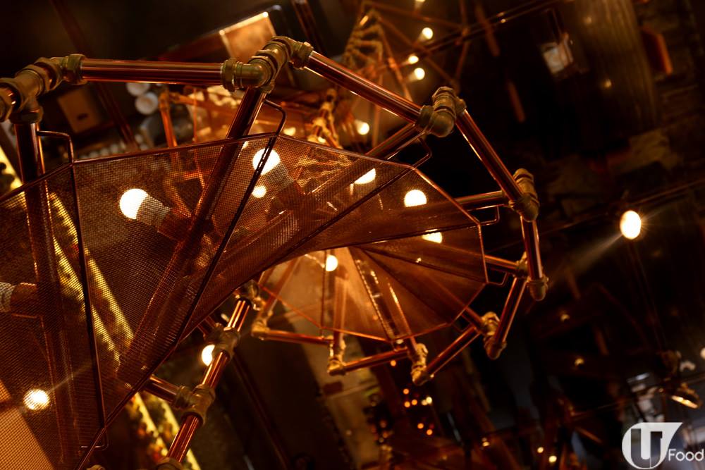 Ammo 位於的亞洲協會香港中心在 19 世紀中期是英軍軍火庫,室內設計亦環繞軍火庫,色調以銅為主。天花板垂下的迴旋樓梯吊燈,好特別。