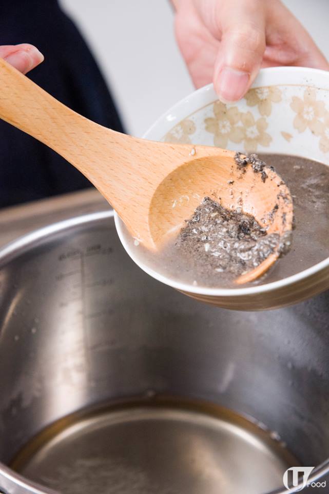 (5) 芝麻材料磨成蓉後,就用匙羹將材料推進碗裏,直到磨完所有材料為止,備用。