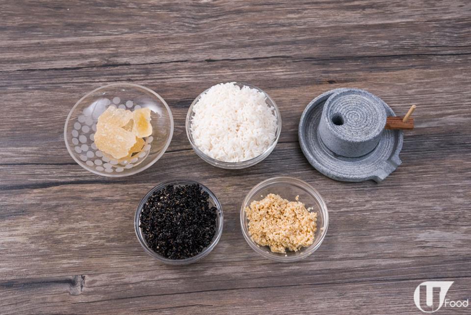 (1) 白米先浸過夜備用;磨前先將黑芝麻、白芝麻及白米均勻混合。