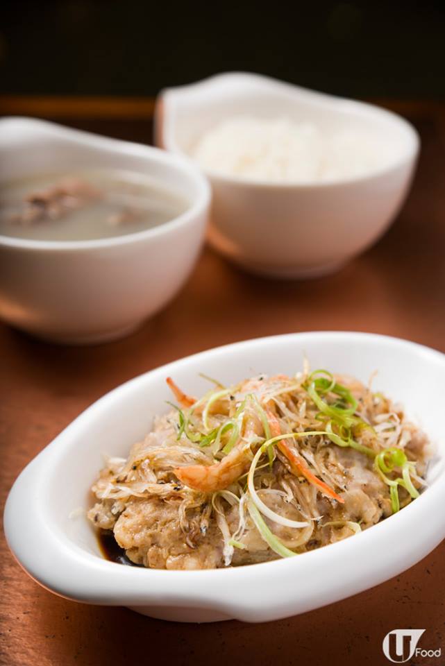 肉餅混入了土魷粒,鋪上大量的蝦乾及鹹魚乾同蒸,鹹香得來又口感豐富,配飯之餘仲送個超足料的例湯,好有住家 feel。