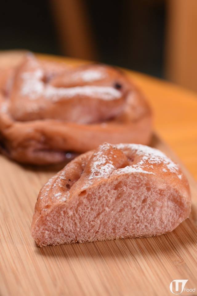將玫瑰味調味粉加入軟包麵團內,整個麵包都是勁靚嘅粉紅色,仲有淡淡花香。中間混入了少許藍莓醬,增加酸甜嘅味道。