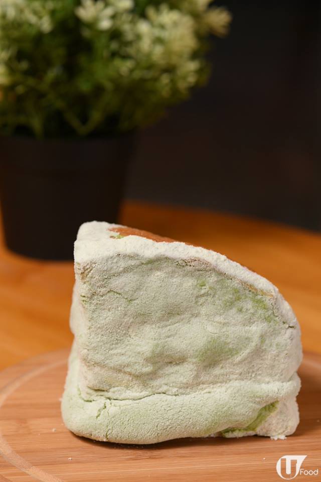 麵包外表鋪滿粉狀,微微綠色,賣相不算討好。不過之前試過原味芝士軟包,對佢嘅味道有信心!同樣用自家培養天然酵母再經 3 次發酵製作,可想而知幾咁鬆軟!新出嘅抹茶味用日本宇治抹茶粉,加澳洲及新西蘭的忌廉芝士炮製,芝香十足,抹茶味適度,帶少許回甘。最讚係中間兩層抹茶芝士餡多到滿瀉,一咬即時唧出嚟!芝士狂迷表示好滿足!
