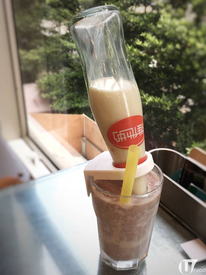 維他奶與紅豆冰已經唔係第一次玩 crossover,早前華星冰室亦試過,以紅豆冰加維他奶,代替花奶,係另一番味道。「美心香港地」玩得更盡,最近去幫襯,就發現呢款「高難度動作」紅豆冰!將原枝維他奶倒轉插進紅豆冰內,似足早前大熱、將啤酒倒插入伏特加沙冰的 cocktail 一樣,出位嘅賣相,一定係相機飲先啦!放心,玻璃樽有個小座固定,唔會跌爛倒瀉。