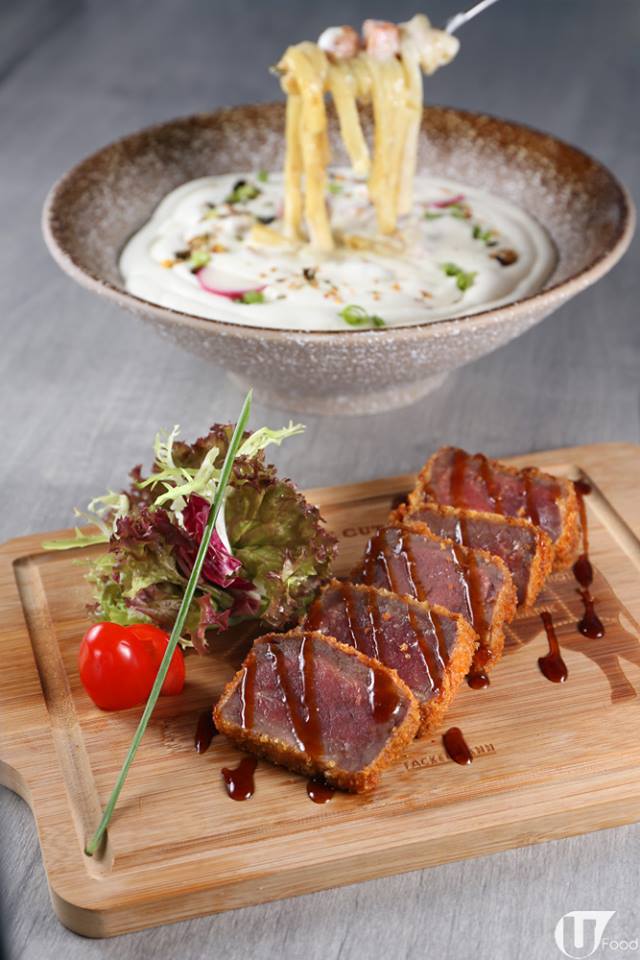 韓國大熱嘅吉列牛扒,安格斯西冷牛肉撲上勁薄的吉列粉炸,牛肉醃過後慢煮至大約 6 成熟,牛味濃而嫩,咬口比 medium 好,可蘸烏冬的忌廉吃,烏冬以日本甜咖喱加上青蘋果煮,香香甜甜。