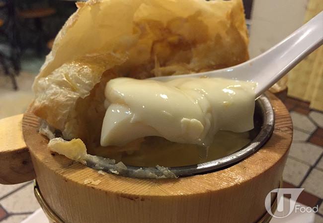 豆腐花溝埋浸濕咗嘅酥皮,賣相真係唔靚。味道係酥皮嘅牛油味太濃,完全蓋過豆腐花味!鹹嘅牛油酥皮同甜嘅豆腐花,明顯溝唔埋,做唔到 perfect match,味道好奇怪。浸濕咗嘅酥皮變咗糊仔,口感一般!我幻想,如果換咗菠蘿包皮,整碎後甜甜哋脆脆哋,味道可能會好啲!假如你想試新嘢,或者挑戰自己,都可以試下嘅!