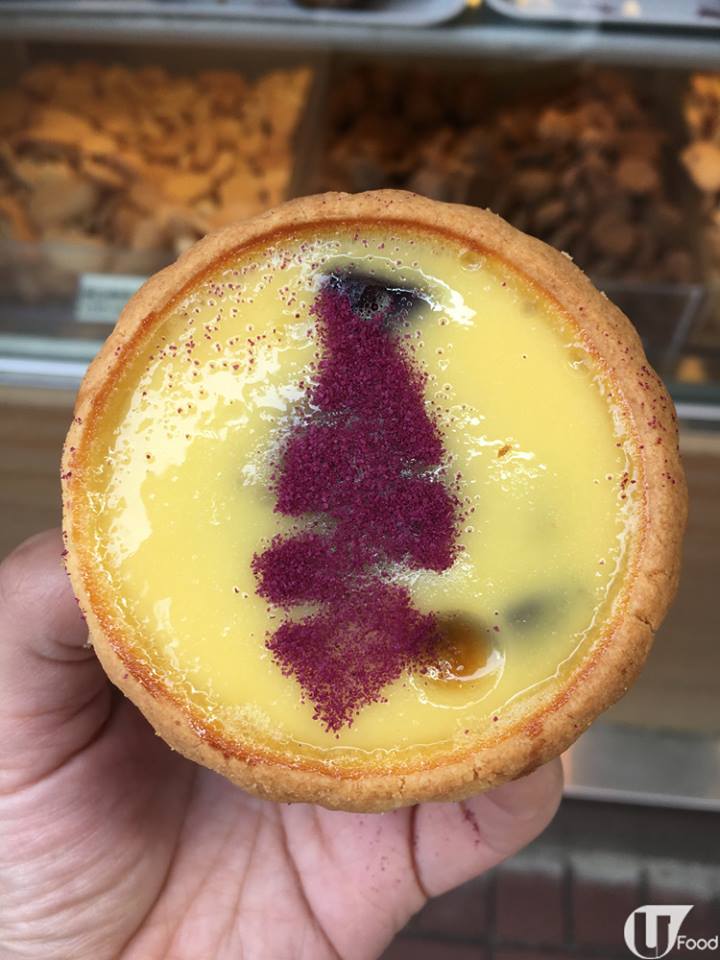 蛋撻賣相好特別!我以為係成個紫色,點知係黃色蛋漿中透出一抹深紫色,原來係灑咗紫薯粉,加啲想像力,有啲似閃電圖案,黃襯紫都幾搶眼!