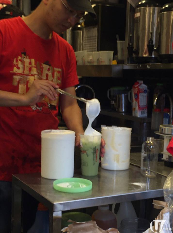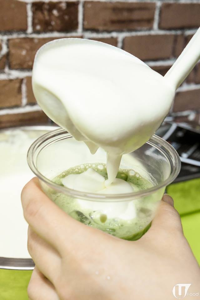 沖好抹茶底後再倒入預先打發好嘅芝士奶蓋。