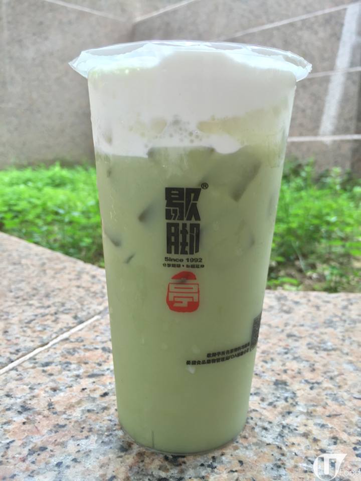 「歇腳亭」呢排憑一系列變色蝶豆花飲品,再次擠身人龍店。原來店內都有一系列芝士奶蓋飲品。芝士奶蓋可配紅茶、烏龍茶、綠茶及抹茶。店員解釋,貴 $2 嘅抹茶,茶味會比賣 $18 嘅綠茶香,分得好仔細。芝士奶蓋抹茶用膠蓋完全封好,一定要用飲管!但咁飲法只飲到底層嘅抹茶,失去飲奶蓋嘅樂趣!想用完美嘅 45 度角飲,要粗暴地整爛膠封蓋,可惜抹茶入面有大大粒冰,飲奶泡時又要頂住冰粒,唔好一齊飲落肚,好麻煩!
