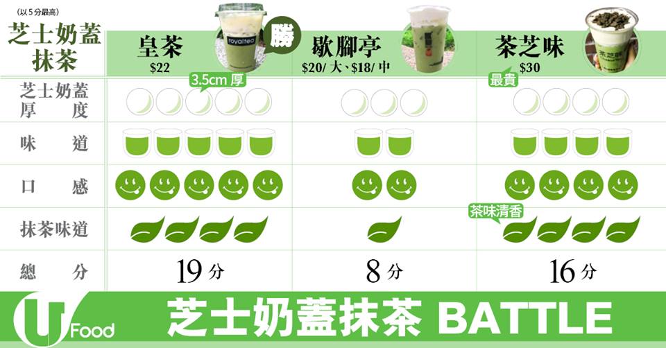 「皇茶」呢個名可能比較陌生,但上網翻查資料,佢哋自稱係首創芝士奶蓋嘅品牌,今次 battle 又點可以無佢呢?皇茶選用澳洲芝士製作招牌芝士奶蓋,足足有 3.5cm 厚,是眾店之首!芝士奶蓋面仲有少少抹茶粉,賣相吸引。用可揭式杯蓋,飲嘅時候唔好用飲管,將杯身傾斜 45 度飲。不過芝士奶蓋極厚身,飲時再大力吸啲奶泡,咁先可以又飲到芝士奶蓋又飲到抹茶。