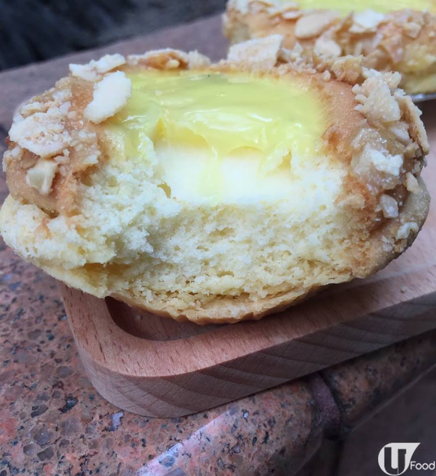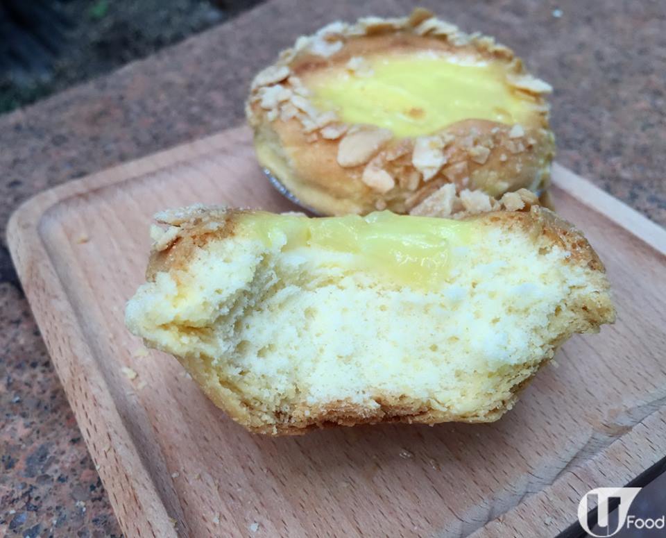 食一啖,終於揭開佢神秘面紗!牛油撻皮好薄身,上面果層好似菠蘿皮,可惜唔係!食落微微鬆化,好似烤烘過的蛋糕或麵包表皮,幸好有杏仁片增添口感。或者菠蘿撻嘅外表太似蛋撻,搞到小記以為中間有蛋漿。原來表面令立立嘅唔係蛋漿,而係一層糖漿。咬落去,又無蛋,取而代之全是牛油蛋糕!