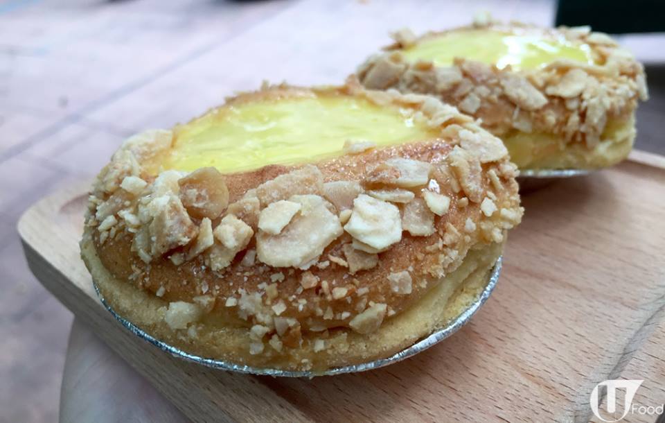 撻嘅旁邊沾上杏仁片,杏仁片唔算脆身,味道好甜,應該有用糖烤烘過。