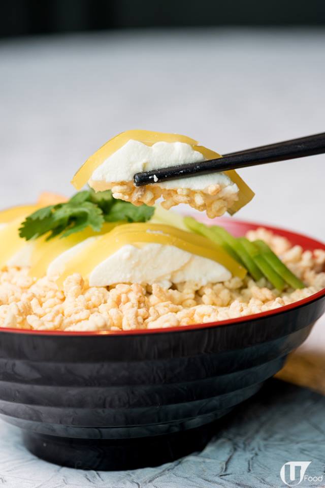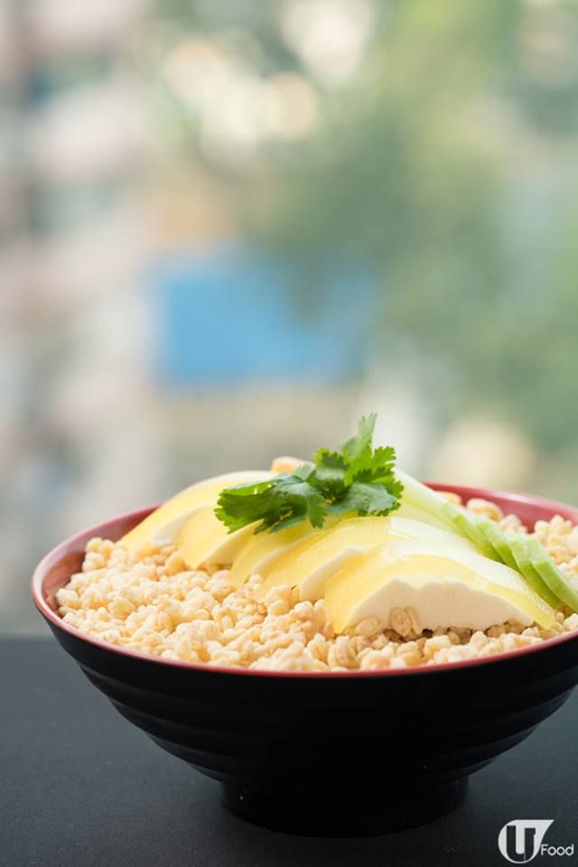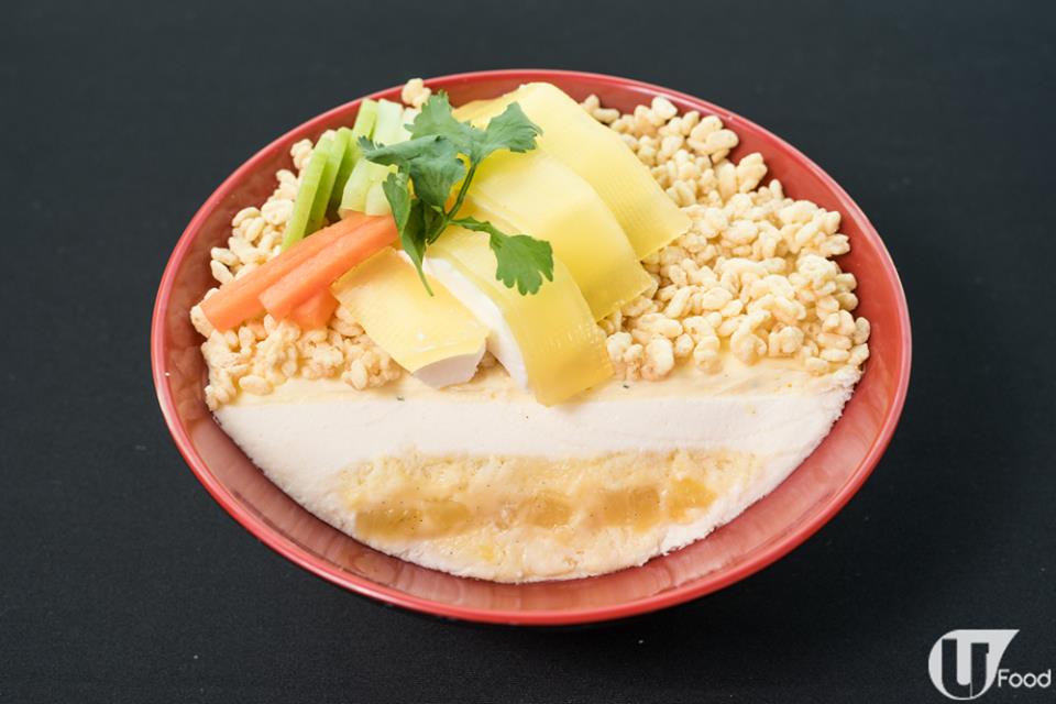 「海南雞」係菠蘿果蓉啫喱 + 椰子慕絲,「飯底」則係呍呢嗱味海綿蛋糕,配上鮮菠蘿果蓉啫喱椰子慕絲金不換吉士慕絲,飯粒則是卜卜米