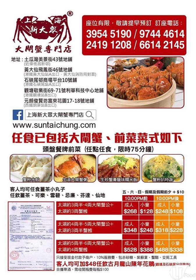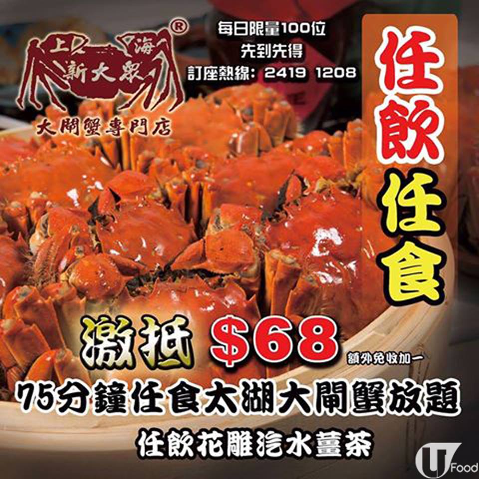 上海新大眾大閘蟹專門店除咗搞咗個「大閘蟹小姐」選舉外,最近又有新 gimmick,就係 $68 任食大閘蟹!任食 item 同 $268/ 位的一樣,每日在旗下 5 間分店進行,5 間分店名額共 100 個,每日下午 5 點開始派籌,1 人限 1 籌,先到先得。食平嘢,總要付出代價,平成二百蚊喎,抵排啦!