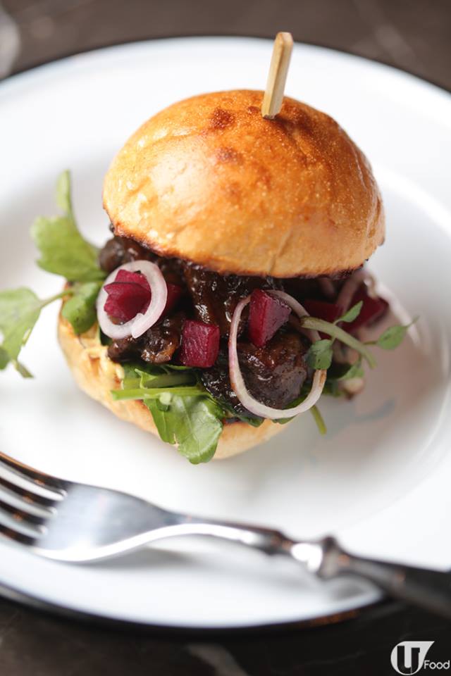 牛尾迷你漢堡 $58 澳洲塔斯曼尼亞草飼牛尾滲酒香,濃郁入味,伴以醃紅菜頭、西洋菜、青葱及第戎芥末。