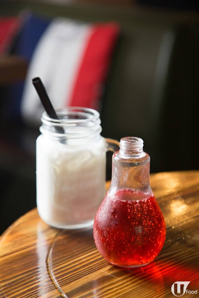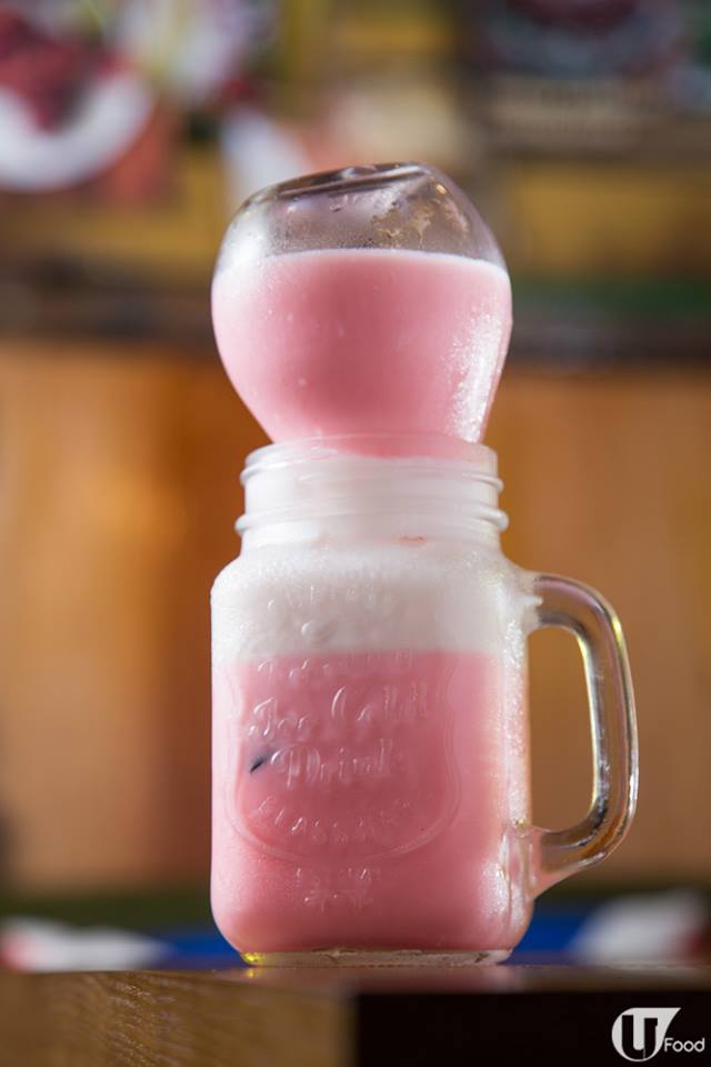 紅色的西瓜味 soda,雖不是鮮榨果汁,但飲落冇藥水味,倒插在牛奶 soda 上,味道似忌廉溝鮮奶。紅與白溝埋,變成粉紅色,好少女 feel。
