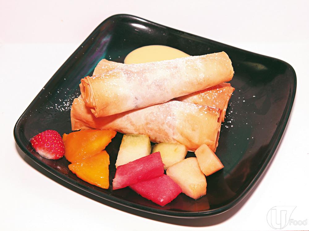 即叫即製,外層如春卷皮,中間夾香蕉、提子乾及花生醬,味道帶鹹嘅花生醬正好中和甜膩嘅熱香蕉及提子乾。