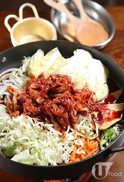 傳統韓國街邊市場找到的路邊炒豬雜,豬大腸、豬粉腸及豬腩肉先用韓式醬料炆 2 小時,再加入韓國魚片、粉絲、韓國大蔥、青尖椒等邊滾邊兜煮,非常惹味,吃到最後可加 $38 點叫一份雞蛋、芝士、紫菜,由 Oppa 即場炮製炒飯。