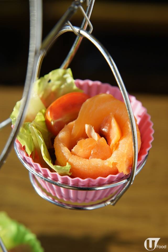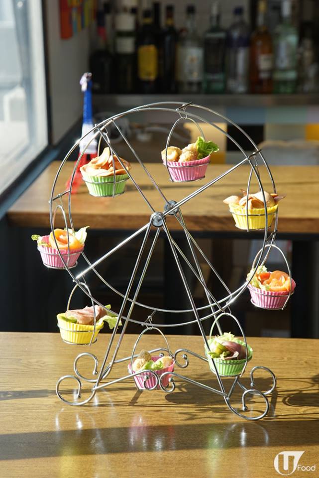 美少女覺得甜點未夠皮,仲想心多試埋鹹點,就可以另外加 $98 配「摩天輪」,同樣精緻的輪架上有齊西班牙火腿露筍卷、挪威煙三文魚、玫瑰脆香芝士、香炸法蘭克福腸等,大滿足!
