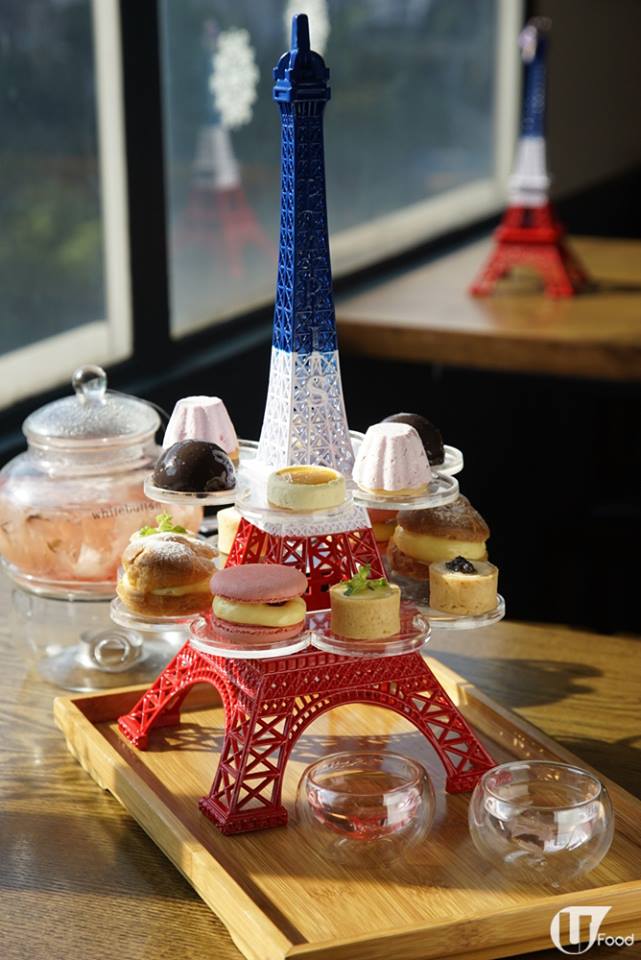 唔使羨慕人哋 instagram 呃 like 相,依家去尖沙咀 White Button Cafe & Dessert 歎返個「鯨吞艾菲爾 Eat Eiffel in your stomach」一樣可以吸 like!Tea set 一上枱,個法國國旗紅白藍艾菲爾鐵塔,真係會令女仔尖叫!架上有兩層花花型透明架,放上甜品,食嘅除了美麗糕餅,仲係法式浪慢。