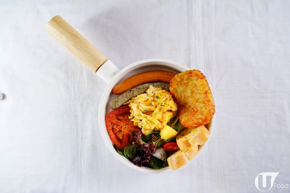 德國香腸 + 炒蛋 + 香烤番茄 + 田園沙律+ 蒜蓉多士 + 香脆薯餅 $118