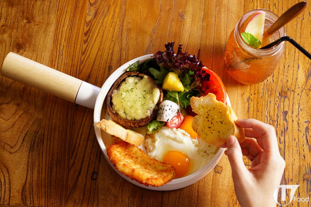 焗釀大菇 + 田園沙律 + 蒜蓉多士 + 香脆薯餅 + 煎蛋 + 香烤番茄 $118