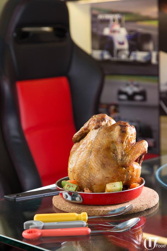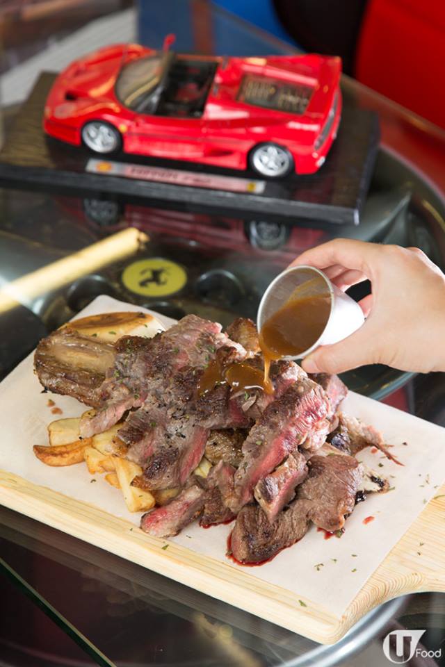 食物為配合主題,以烤焗的西式肉食為主,如燒牛肋骨、燒春雞、炸魚薯條等,也少不了沙律、薄餅、意粉、甜品等,共廿多款,由五星級酒店西廚 Sam 哥主理。兩磅重的燒牛肋骨,是每枱必點的招牌菜,因為大份夾抵食!用上美國 Prime Grade 穀飼牛肋骨,收到柯打,才用百里香醃一醃,放進焗爐燒至 medium rare,蘸上用牛骨、紅酒熬成的燒汁,更加 juicy,難以相信只賣 $138!大廚在肉食菜式都配上好多蔬果,唔想食肉咁 heavy,亦可試呢度的炸魚薯條或者 pizza,也做得有驚喜。飲品 menu 可找到老闆的飛佛,3 款用跑車牌子命名的特飲,包括林寶堅尼、法拉利、麥拿倫,配嘢食一流!