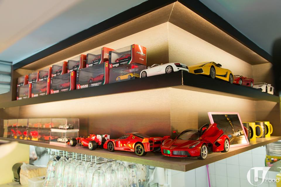 比鄧達智間 cafe 更搶眼的,有呢間門口頂住架紅色跑車的 cafe,原來老闆是鄧達智的堂弟,而且係一個超級跑車迷。一進店,就可以感受到他對跑車的熱情 ── 賽車紅綠燈、紅黑賽車座椅、黑白賽旗地板,還有用真呔鈴打造的玻璃枱,以及收藏多年的法拉利模型車、拼圖,侍應都穿上賽車 Tee,鋪天蓋地都是跑車賽車,成間舖都係影相位!