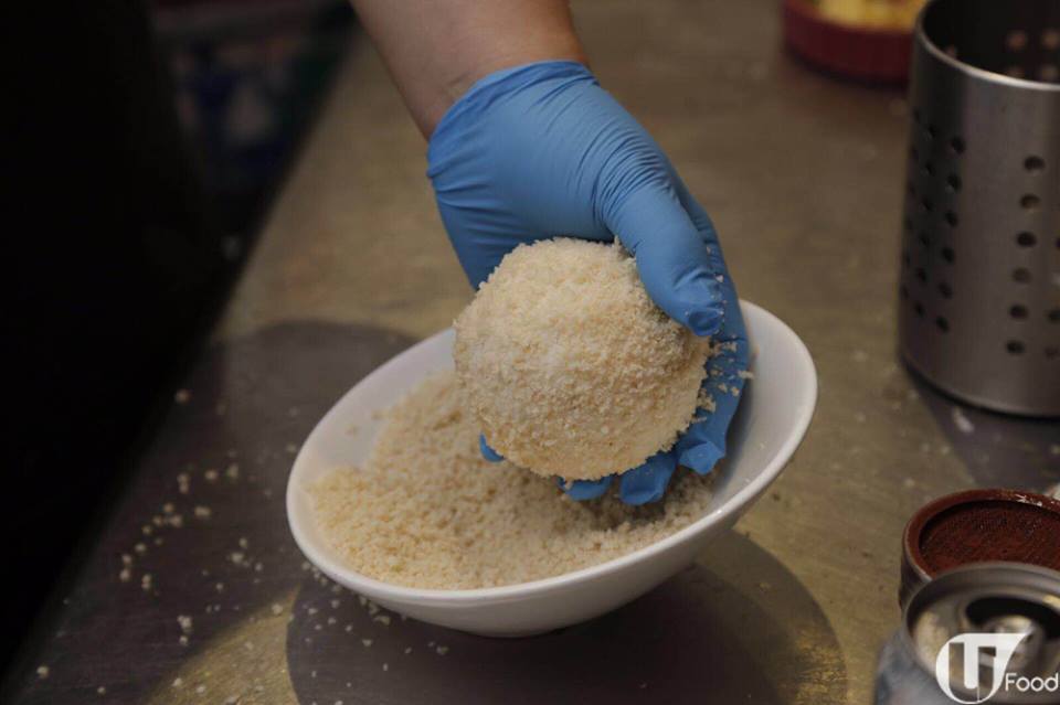 搓到圓碌碌後,將飯波蘸滿炸粉。
