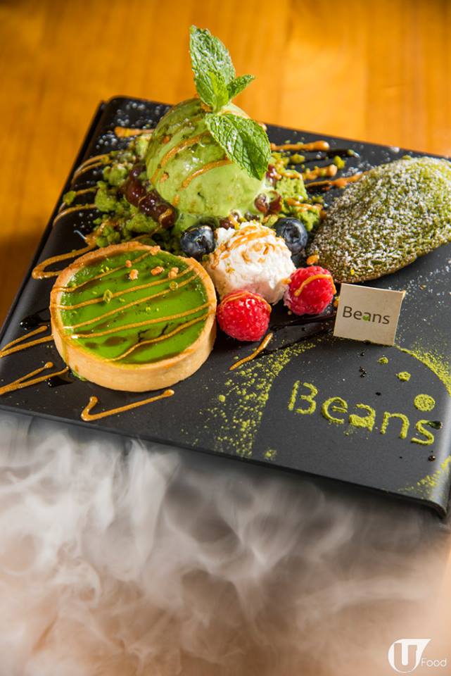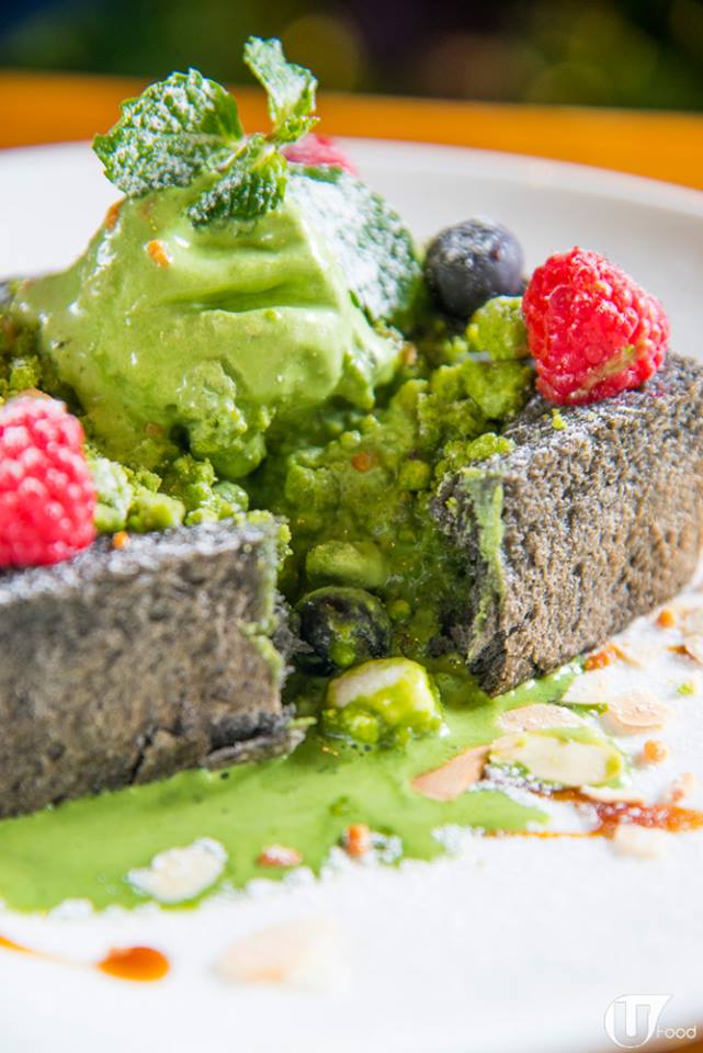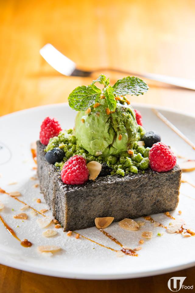 成件吐司最吸睛的,是用上墨汁製作嘅黑色型格吐司,配埋綠色雪糕及紅莓襯托,好型格!食一口綠茶雪糕,奶香沒被抹茶味道掩蓋,切開黑色的墨汁吐司,抹茶醬又沒有預期如岩漿般湧出,不過吐司有微微鹹味,配合抹茶醬一齊食,可平衡甜味,味道唔錯!記得要食埋吐司上的綠茶餅乾脆,好有咬口。