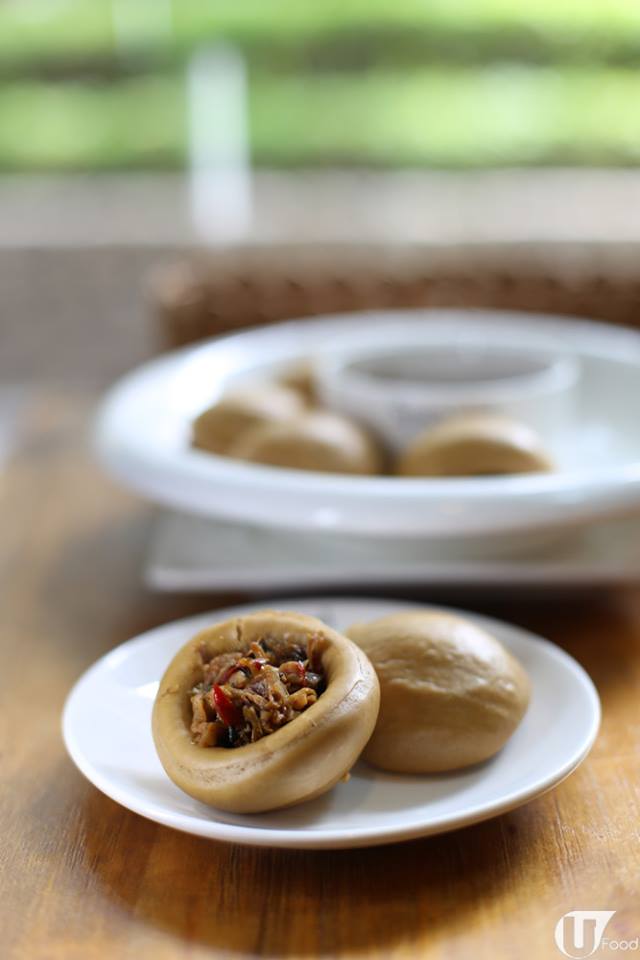 自製的麥子甜包,底部的確有個小窩,自己動手把風乾和以薑蓉等醃味及蒸香的通菜、大白菜粒釀在小窩裏,鹹中帶甜,有趣!