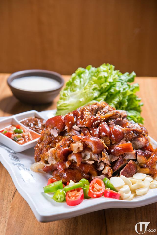 用新鮮豬手啤水後還要先後用不同材料煲兩次,用足 15 種香料炆軟,吃起來軟腍卻仍保彈性,點韓式魚蝦醬或豆辦醬,再加蒜片、辣椒捲成生菜包吃。