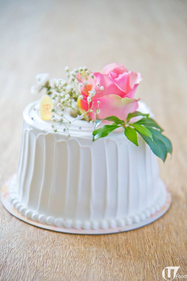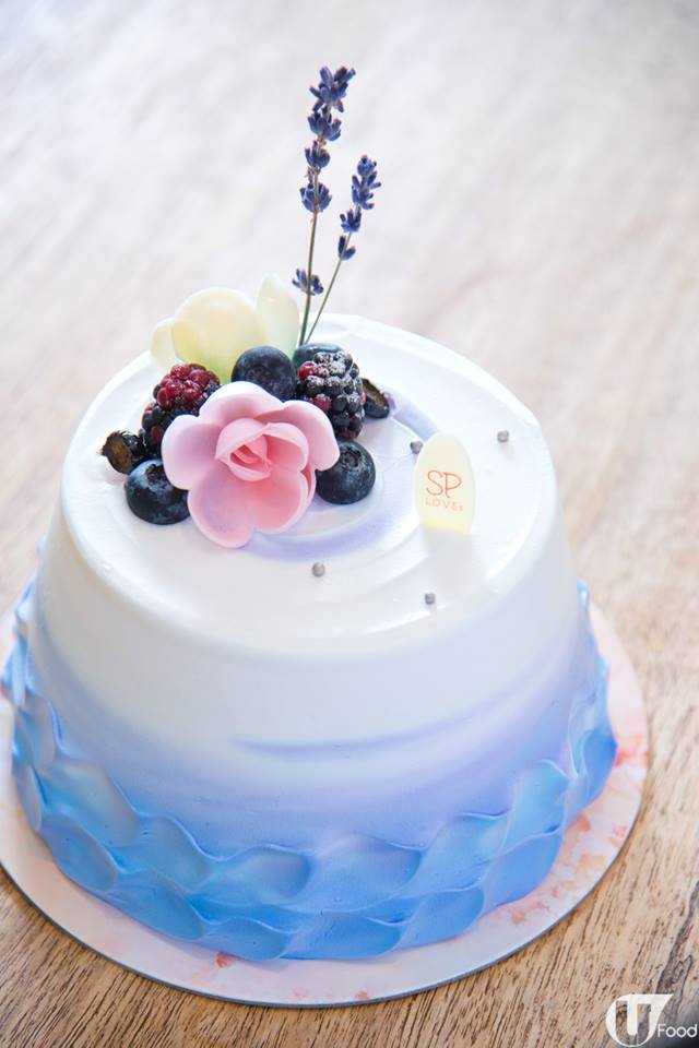 黑加侖子藍莓雪芳蛋糕用可食用米紙花點綴,色調浪漫,蛋糕柔軟輕盈。