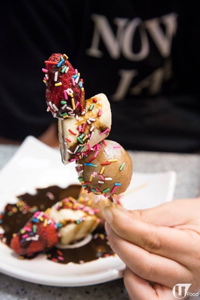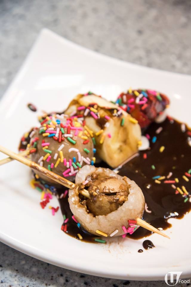 呢款甜食串燒,驟眼睇以為係生果 + 糖不甩,原來係新鮮士多啤梨、香蕉配西米!不過今次西米皮包住嘅係金莎!淋上朱古力漿及彩色朱古力針,賣相好繽紛!不過因為金莎本身好大粒,加咗西米皮後 size 幾乎同乒乓波咁大,以竹籤拮住,一咬就散開晒!不過味道都幾過癮!