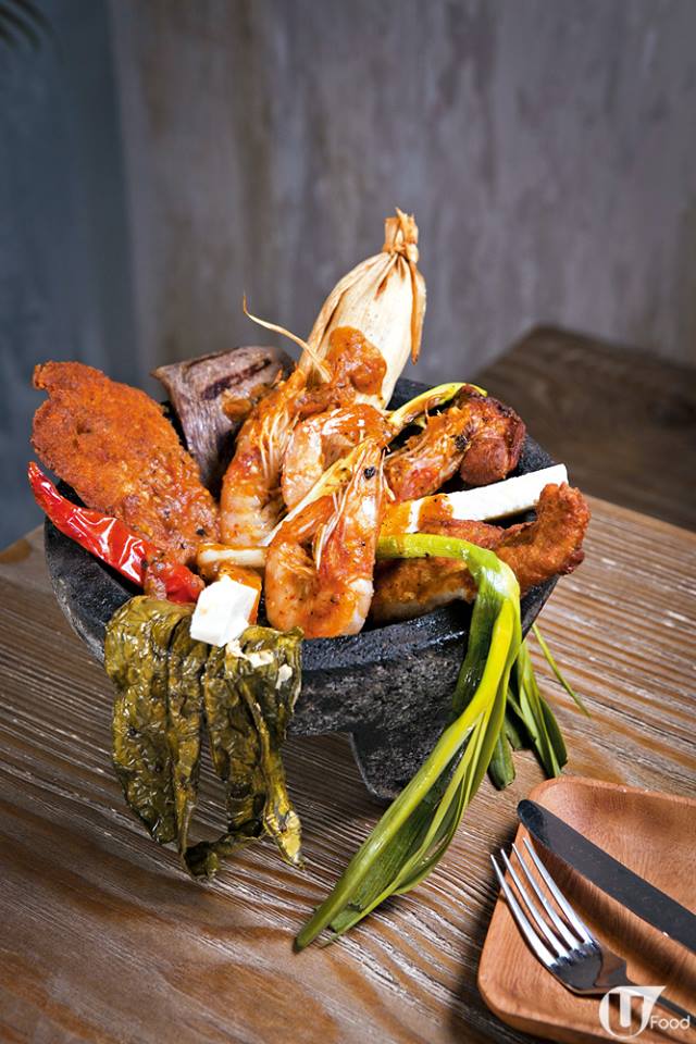 已燒熱的火山石缽上桌時熱得滋滋聲,好有食鐵板餐feel!裏面放滿了自家製辣肉腸、美國Skirt steak、牧場芝士、鮮蝦、雞肉、仙人掌及魚肉等,以岩鹽、香料等調過味,香口惹味。