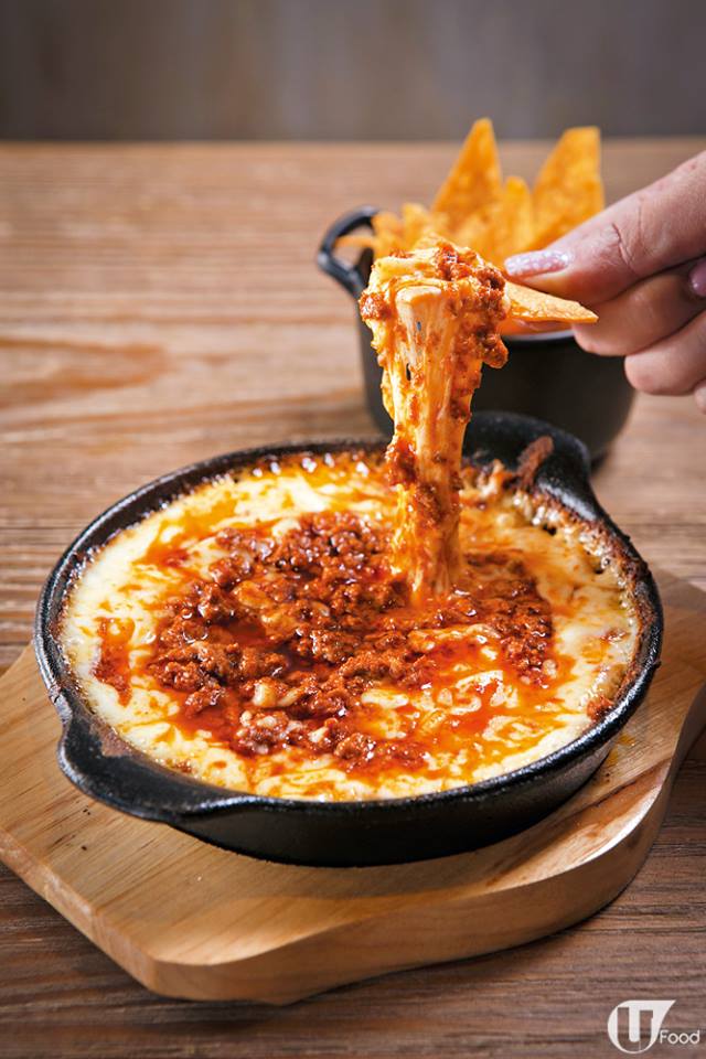 估唔到墨西哥菜都興玩拉芝士!這裏用的墨西哥芝士主要來自產地Oaxaca,味道微鹹可拉出芝士絲,中間還加了自家製的辣肉腸碎,用Tortilla Chips沾來相當惹味。
