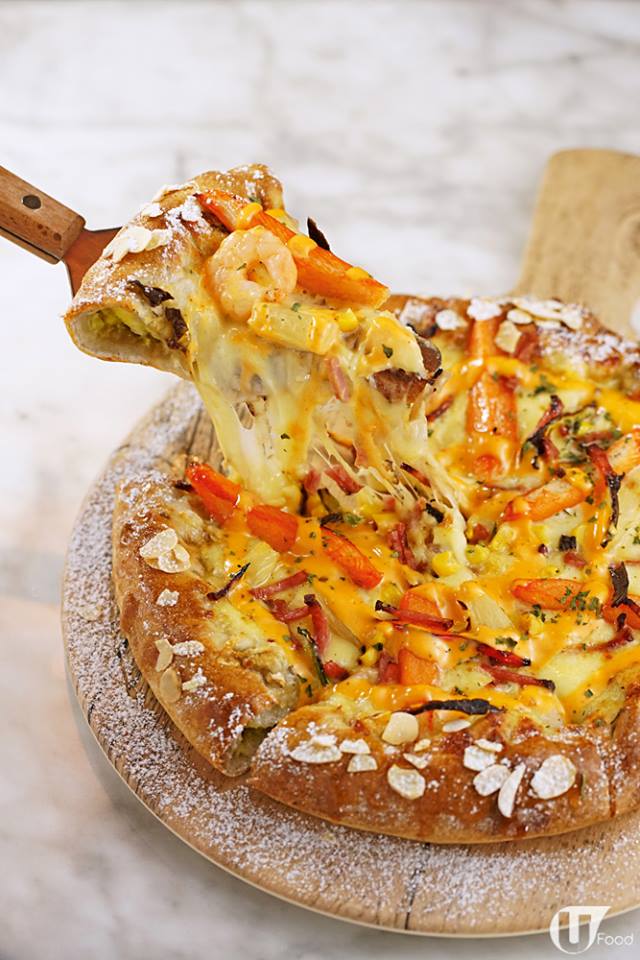 薄餅底以黑米及多種穀物製成,批邊加上蜜糖、杏仁及內裡的芝士,鬆脆香甜。薄餅不像傳統般使用番茄醬,廚師反而加入牧場醬及泡菜蛋黃醬,更添美味。