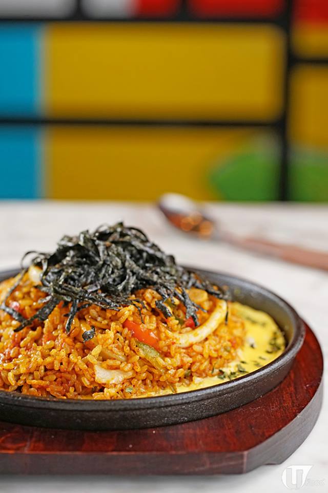 拌飯加入魷魚、燈籠椒、紫洋蔥及辣椒醬等同炒,香辣惹味,若怕太辣可拌以旁邊的炒蛋同吃,吃後令人回味無窮。