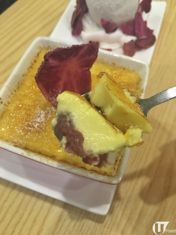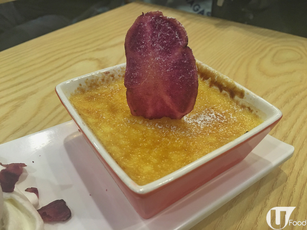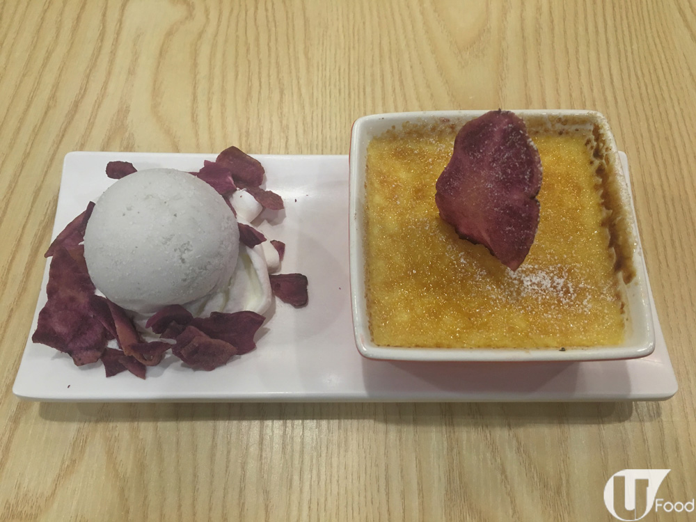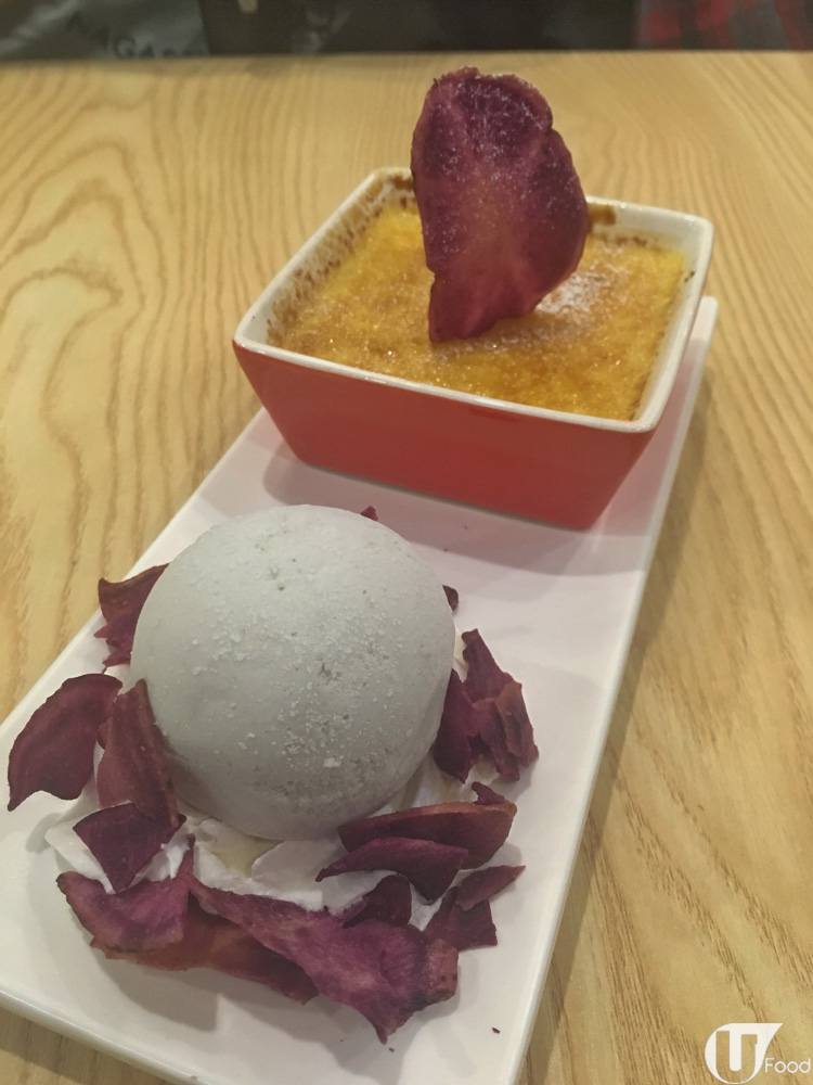 一上桌,有驚喜!紫薯燉蛋仲有雪糕配,一冷一熱好過癮,而且一個甜品有兩食,啱晒花心鬼。單睇形表,焦糖燉蛋面插咗大片紫薯乾,而雪糕旁亦放滿小紫薯乾,似模似樣。匙羹一舀,焦糖應聲裂開,燒得非常脆!