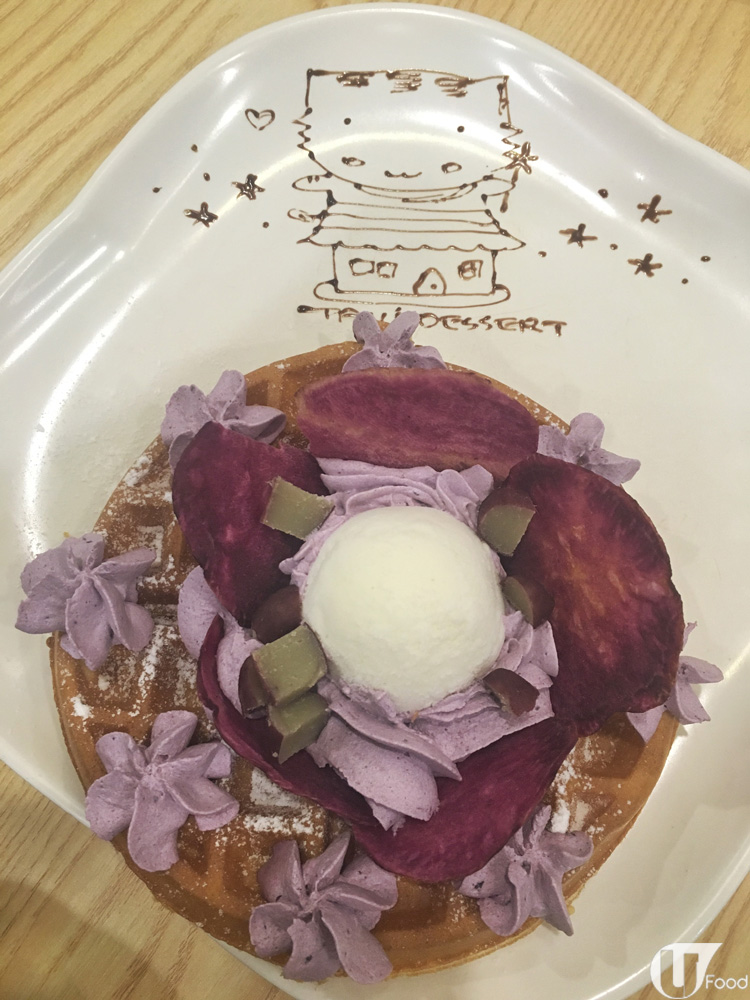 除咗燉蛋,仲有紫薯窩夫。窩夫上唧滿紫薯味的 cream,而且加上紫薯片、紫薯粒及雪糕,賣相好女仔好繽紛。